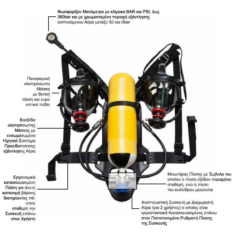 Συναγερμός σε οποιαδήποτε απόσταση: η τεχνολογία της αναπνευστικής συσκευής διάσωσης εκμεταλλεύεται την μέση πίεση για τη μετάδοση του ηχητικού σήματος συναγερμού. Αυτό επιτρέπει στον χειριστή να απομακρυνθεί από το σετ Κύλινδρος-Μειωτήρας-Μανόμετρο και παράλληλα να μπορεί να λάβει το αντίστοιχο ηχητικό σήμα συναγερμού εξάντλησης του αέρα.