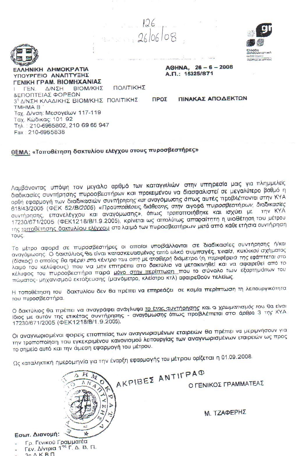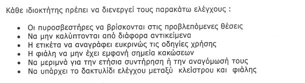 http://www.elinyae.gr/el/lib_file_upload/52b_05.1116498310987.pdf Κοινής Υπουργικής Απόφασης των Υπουργών Ανάπτυξης και Δημοσίας Τάξης «προϋποθέσεις διάθεσης στην αγορά πυροσβεστήρων, διαδικασίες συντήρησης, επανελέγχου και αναγόμωσης»